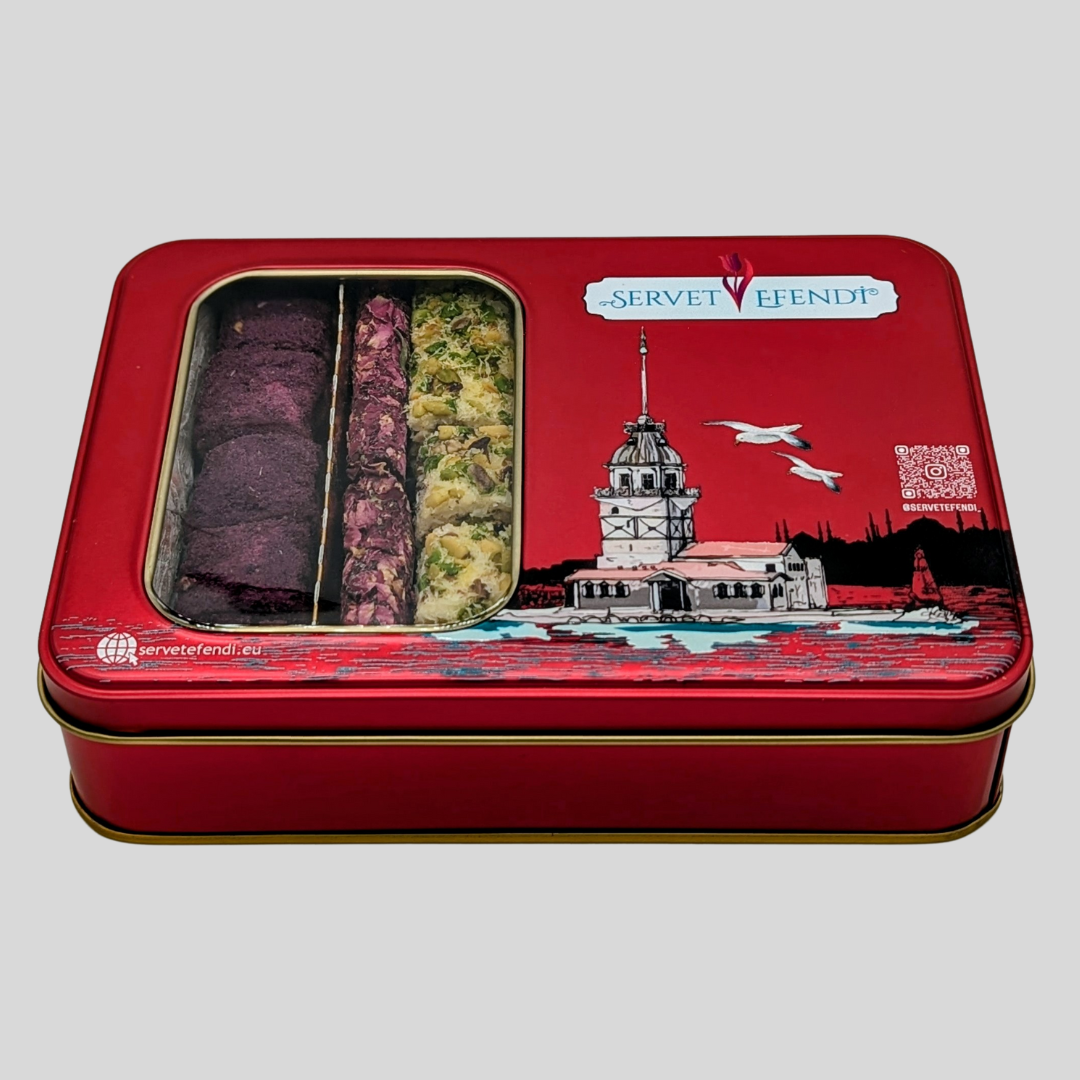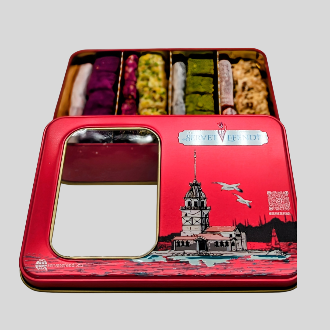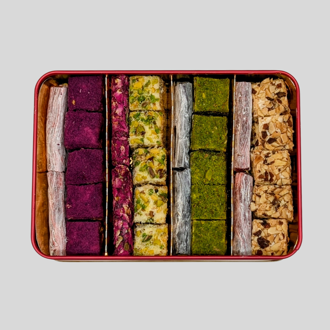 Tatlı tutkunları için özel olarak hazırlanan Antep Fıstıklı Baklava Dilim ve Parmak Lokum Mix, 700 gramlık METAL kutularda geleneksel lezzeti en şık haliyle sunuyor!
