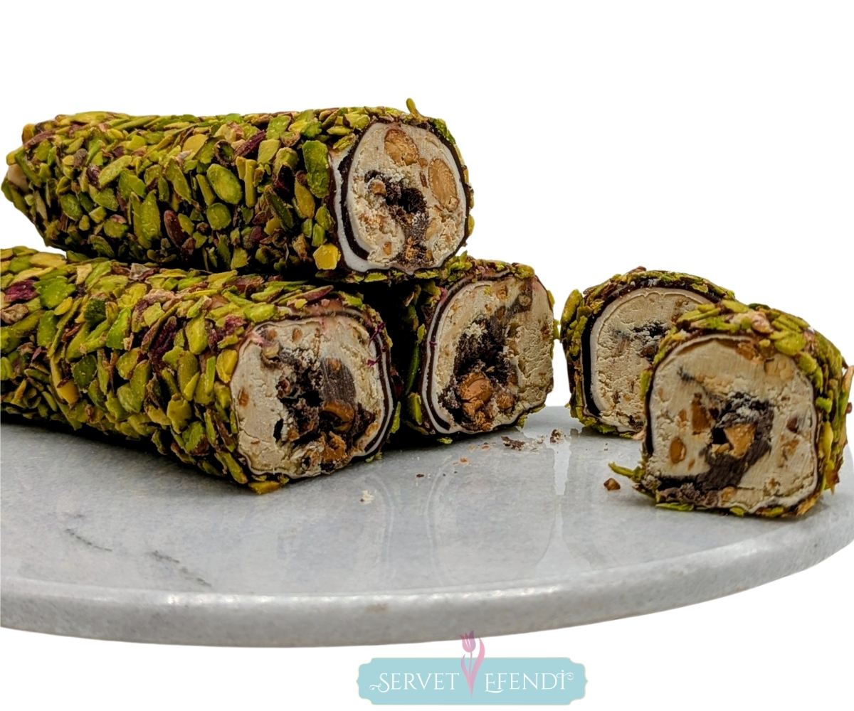 İncecik sarılmış lokum katmanları, içerisine özenle hazırlanan çikolatalı dolgu ile zenginleştirilir, dışı bol file Antep fıstığı ile kaplanır.