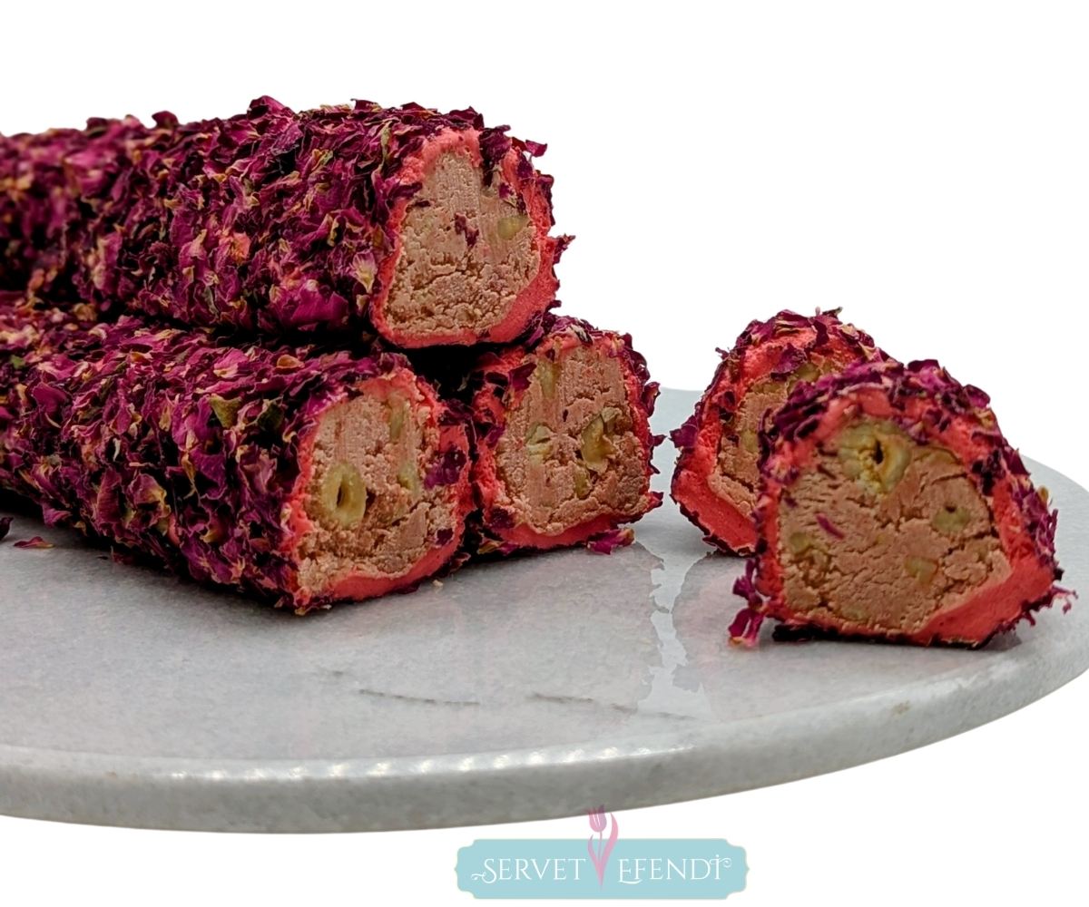 Mega Gül Yapraklı Fındıklı & Frambuazlı Sarma Lokum, lokum ustalığının en modern yorumlarından biri.