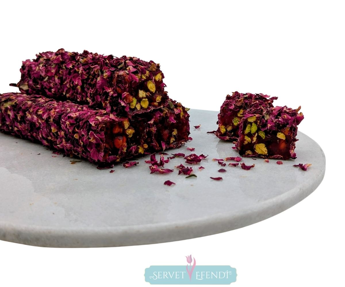 İncecik fitil lokumun merkezinde taptaze Antep fıstıkları, dış yüzeyinde ise hafifçe serpilmiş gerçek gül yaprakları ile benzersiz bir tat deneyimi sunar.