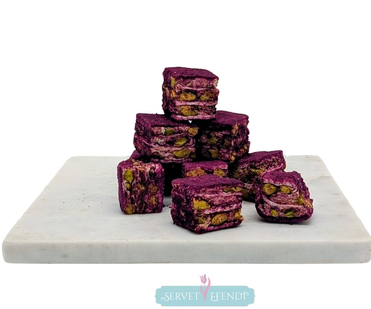 Bu eşsiz lokum, özel bir tarifle hazırlanan özenle seçilmiş fıstık ve gerçek karadut kreması öne çıkıyor. Her ısırık, tatlı bir lezzet patlaması yaşatıyor.