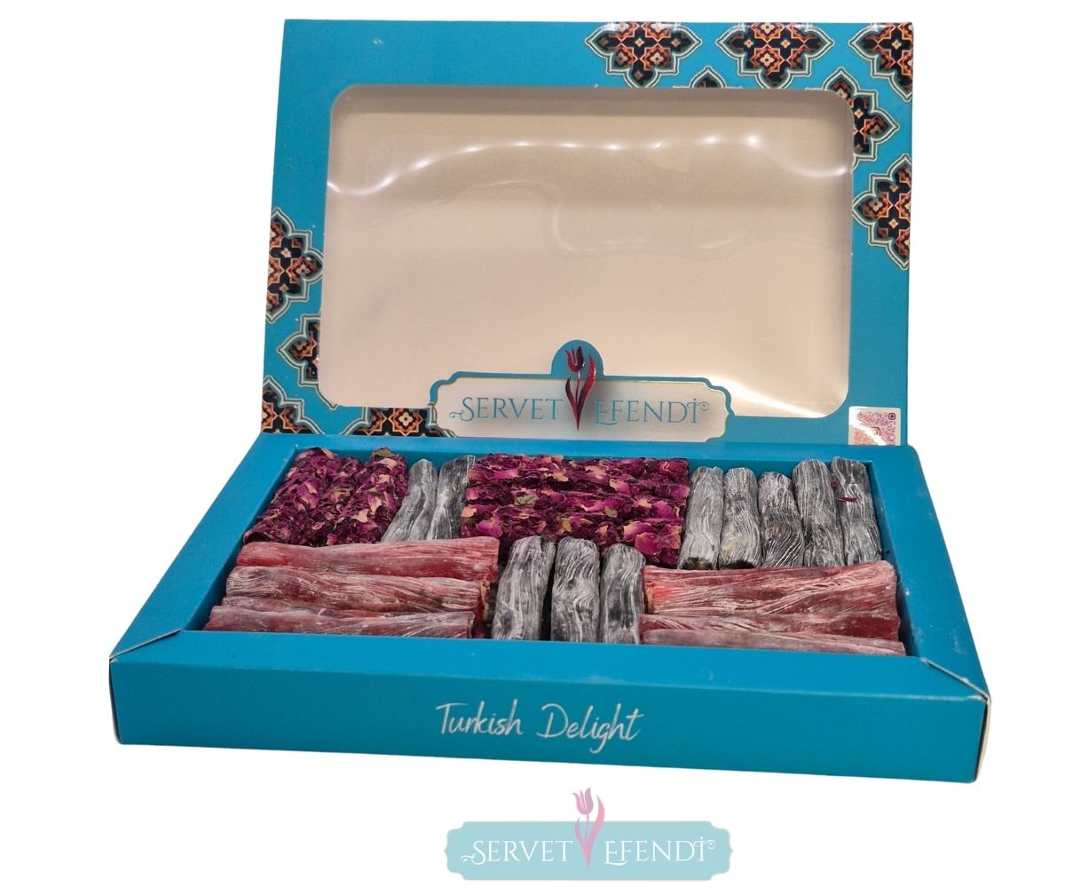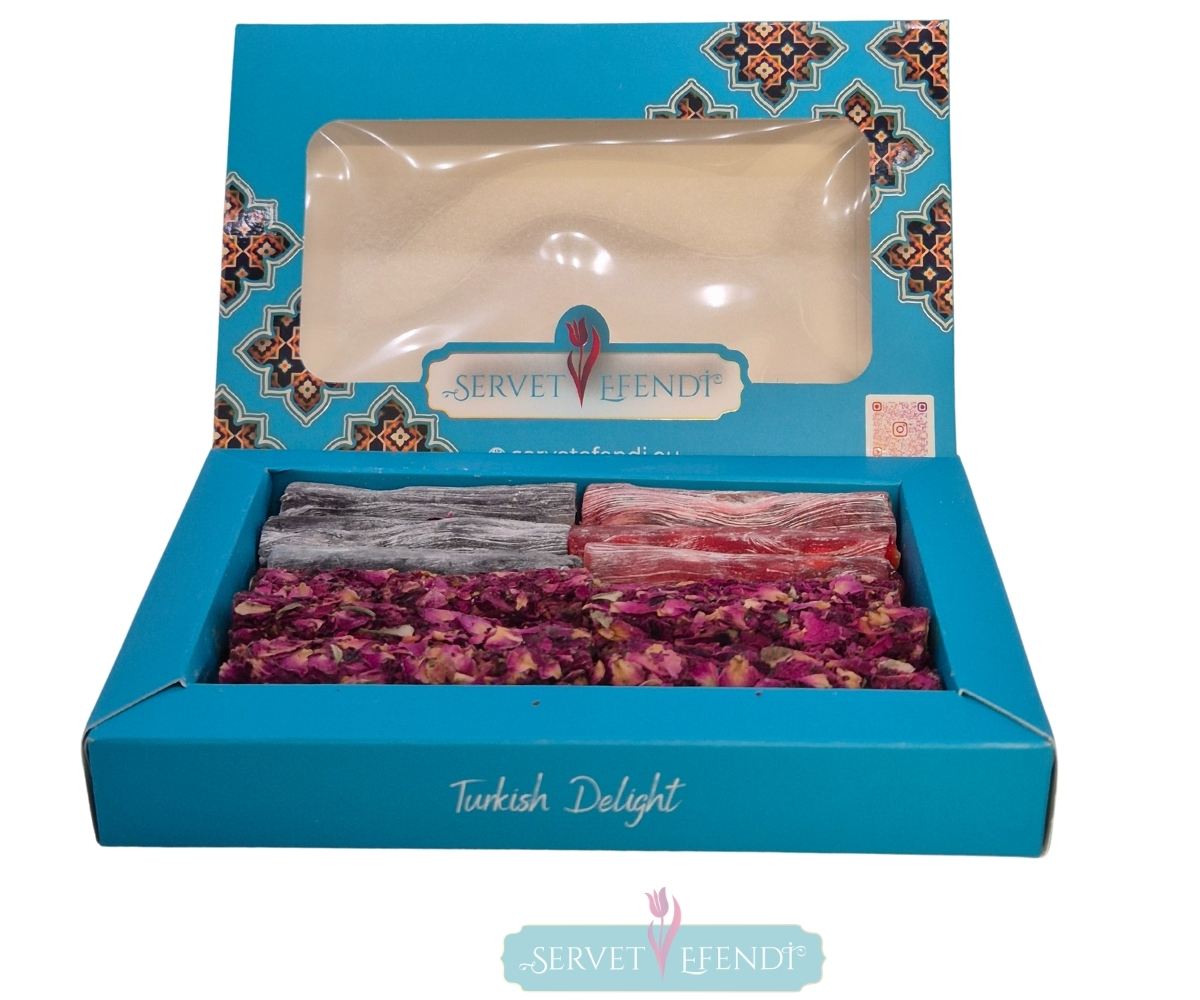 Tarihi Selçuklu desenleriyle bezeli özel kutusunda karışık parmak lokum keyfini yaşayın. Kutu içeriği Böğürtlenli, narlı ve narli gül kaplı 3 çeşitten oluşan bu lezzet kutusu, geleneksel lezzetlerin modern yorumuyla ağızda eriyen bir deneyim sunuyor.
