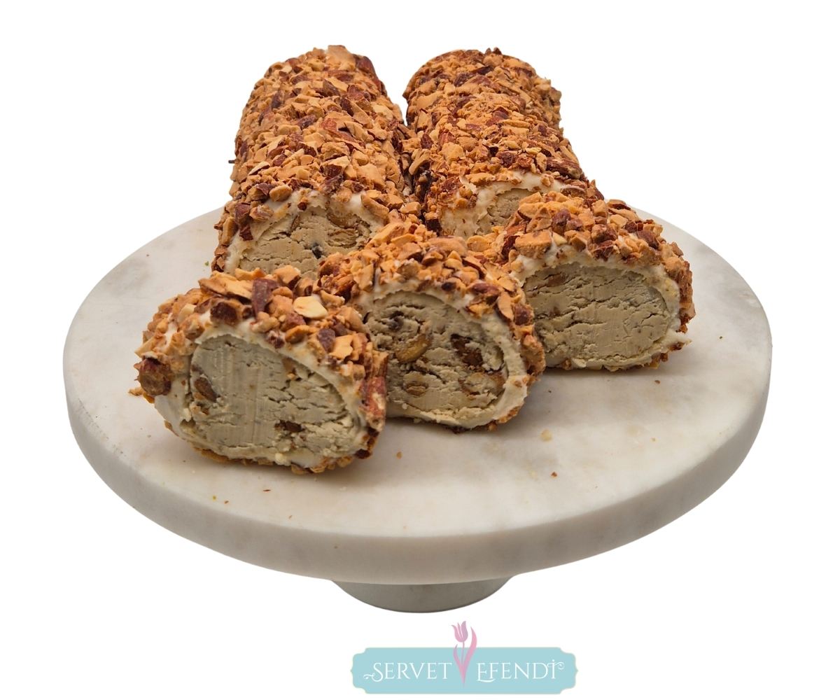 Badem Kaplamalı Bademli Sarma Lokum, incecik lokum katmanının içindeki yoğun badem dolgusu ve dışındaki çıtır badem kaplamasıyla her lokmada iki kat lezzet sunar.