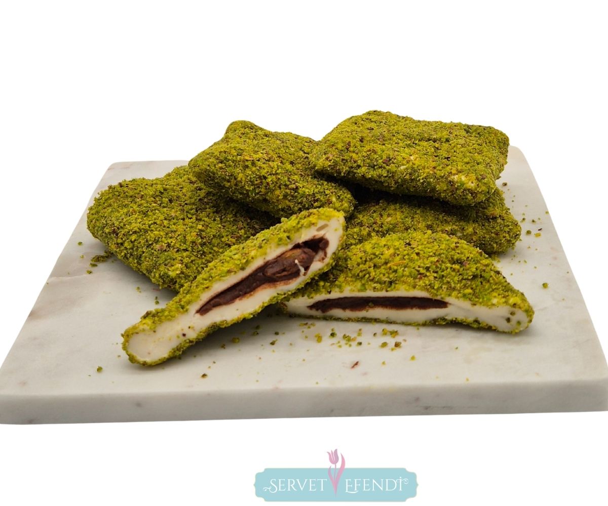 Servet Efendi’nin özel üretimi Toz Fıstıklı Çikolatalı Muska Lokum, geleneksel tatlıya modern bir dokunuş katıyor.
